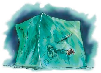 Alone for a short time, each of us began examining the intriguing details of the chamber. There were several doors leading from the chamber, and I chose one at random to investigate. The door I approached was barred, and chained, heavy locks holding everything fast. Inset, near the top of the door, was a window. Standing on a tall stool, I peered through the small pane of heavy glass. Within was one of the most horrifying creatures I had ever witnessed. The beast was an icy gelatinous cube, nearly two yards to a side. I watched it for a moment, its quivery volume holding me entranced. Suddenly it bounced, and impacted the door. I sprung backward with the grace of an eagle, and landed unharmed.